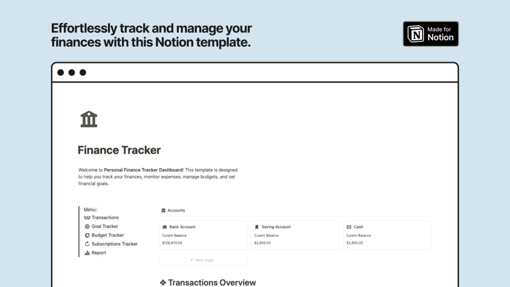The Finance Tracker Notion template is an all-in-one tool designed to help you manage and track your financial journey. It includes several key sections to give you full control over your finances: